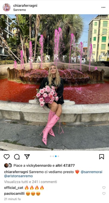 “Sanremo, ci vediamo presto”. Queste le parole contenute in un post pubblicato sul profilo Instagram della blogger e imprenditrice Chiara Ferragni, che sarà ospite di alcune delle cinque serate del prossimo Festival di Sanremo (7-11 febbraio 2023). La nota influencer si è fatta ritrarre davanti e all’interno del Teatro Ariston e seduta sulla fontana dello “Zampillo” due luoghi simbolo della città. E’, poi, stata vista dalle parti di piazza Bresca, il quartiere della movida. Pochi giorni fa, il co-conduttore del Festival, Gianni Morandi, pubblicava sul proprio profilo Facebook l’immagine di un brindisi con Amadeus (direttore artistico del Festival), con la scritta: “8 ottobre. Pronti per Sanremo…”.