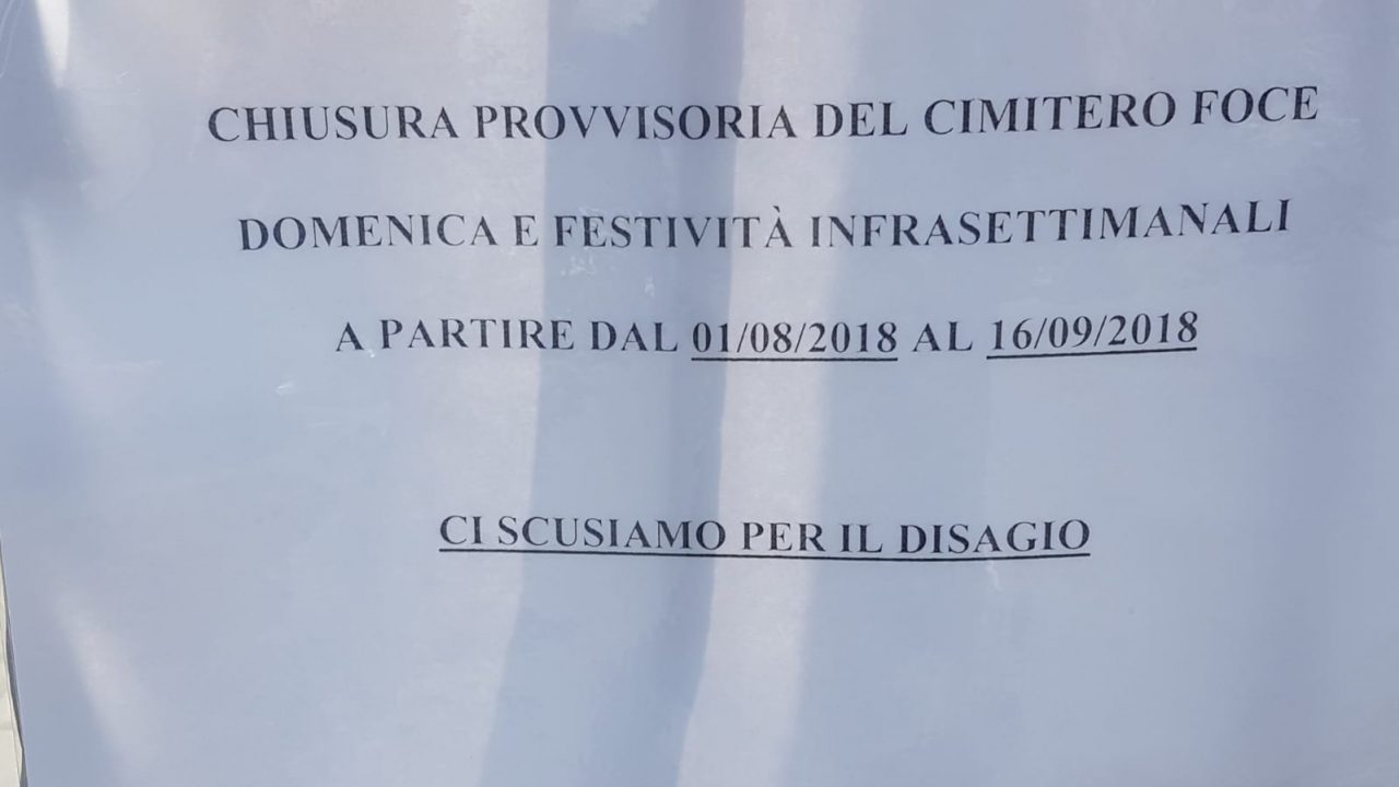 Cimitero della Foce chiuso nei giorni festivi. Questa l’amara sorpresa per chi si è recato questa mattina a visitare i propri cari. Un cartello, affisso sul cancello avverte che il camposanto resterà chiuso dal 1° agosto al 16 settembre la domenica e nei giorni festivi