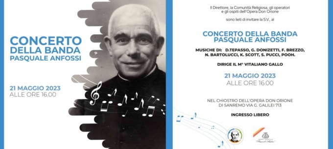 Domenica 21 maggio, alle 16, nel chiostro dell’Opera Don Orione di Sanremo, in via Galilei (civico, 713), la Banda Pasquale Anfossi di Taggia, diretta dal maestro Vitaliano Gallo, eseguirà un concerto. Voce solista Biagio Di Bello. Saranno eseguite musiche di: Tepasso, Donizetti, Brezzo, Bartolucci, Scott, S. Pucci, Pooh. L’ingresso è libero.