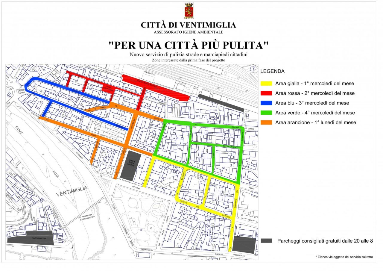 Il servizio di lavaggio intensivo, come già divulgato, interesserà le vie centrali della città (in seguito si estenderà anche in altri quartieri) e avverrà durante tutto l’anno, ad eccezione del mese di agosto; il centro è stato suddiviso in 5 zone, ciascuna delle quali sarà al centro dell’iniziativa una volta al mese (vedi cartina e calendario allegati).
