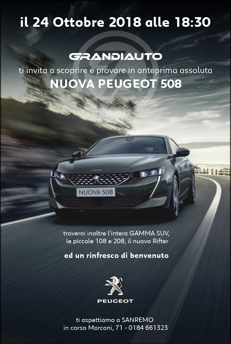 La nuova Peugeot 508 a Sanremo è tutta da scoprire. GrandiAuto organizza per oggi, mercoledì 24 ottobre, l’anteprima assoluta della vettura francese: oltre ad ammirarla sarà anche possibile provarla in prima persona. L’appuntamento è dunque in corso Marconi 71, a partire dalle ore 18.30. Sarà anche possibile visionare l’intera gamma suv, le piccole 108 e 208, il nuovo Rifter e approfittare di un ricco rinfresco. Un evento assolutamente da non perdere, per scoprire la nuova auto e per il progetto “Guidati dall’eccellenza italiana” portato avanti dalla casa automobilistica d’oltralpe.