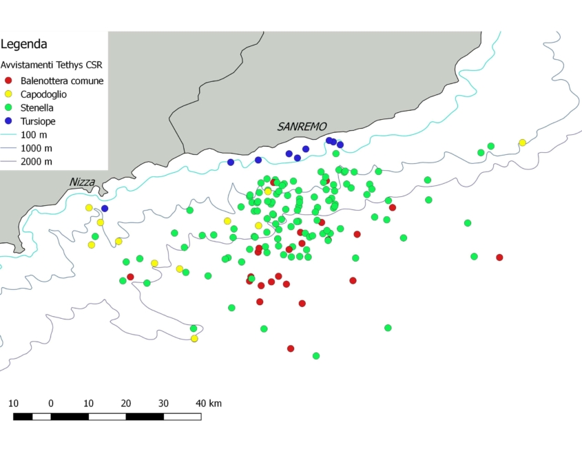I dati sono stati raccolti a margine  del progetto trentennale Cetacean Sanctuary Research (CSR) che raccoglie informazioni sulla presenza di cetacei nella zona più occidentale del Santuario Pelagos, a cavallo tra Costa Azzurra, Corsica e Riviera dei Fiori. Ecco la mappa che l’Istituto Tethys a compilato con i vari avvistamenti, la distanza dalla costa e la profondità delle acque. Ad ogni specie corrisponde un colore diverso