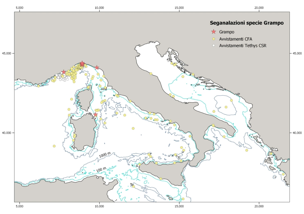 Ecco la mappa degli avvistamenti di Cetacei. Nei nostri mari torna il Grampo