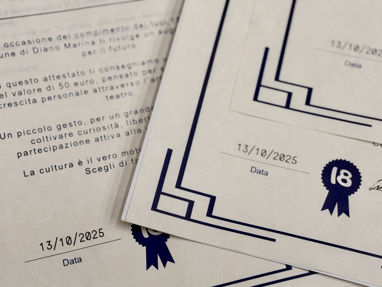 Il Comune di Diano Marina ha festeggiato i suoi cittadini diciottenni con la consegna di un bonus cultura a loro dedicato. L’iniziativa, volta a promuovere la cultura, la formazione e la crescita personale, si è concretizzata oggi, lunedì 13 ottobre, alle ore 16, con una cerimonia ufficiale tenutasi presso la sala consiliare del comune, con il Sindaco Cristiano Za Garibaldi e il Consigliere alle politiche giovanili Valentina Zeccola. Il bonus, del valore nominale di 50 euro, è destinato ai ragazzi e alle ragazze di Diano Marina che hanno raggiunto la maggiore età nel corso del 2024. Questo voucher potrà essere speso esclusivamente per rappresentazioni teatrali e cinematografiche, offrendo così un’opportunità concreta per avvicinarsi al mondo dell’arte e dello spettacolo.