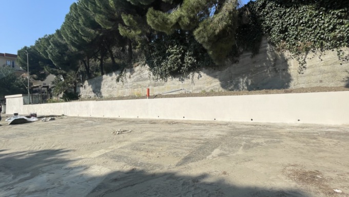 La prima fase, in corso d’opera, riguarda il consolidamento dei muri perimetrali ed il rifacimento di tutti gli intonaci, delle recinzioni degli accessi e dei percorsi, lo smontaggio del vecchio tappeto/moquette e la riqualificazione degli spazi pertinenziali.