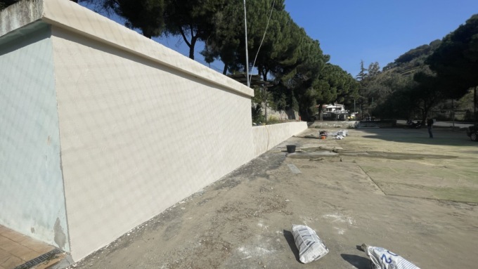 La prima fase, in corso d’opera, riguarda il consolidamento dei muri. La seconda riguarderà la stesura del nuovo manto di gioco in erba sintetica antitrauma