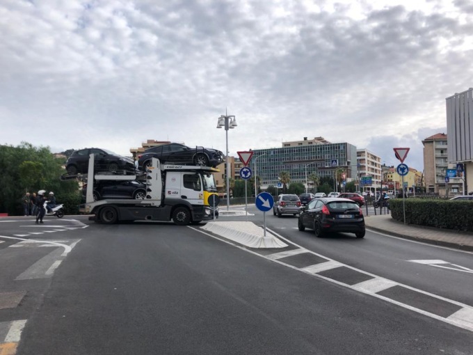 Quello di questa mattina è l’ennesimo episodio in cui un mezzo pesante rimane “incastrato” nella rotonda realizzata recentemente a Imperia. Le dimensioni dei mezzi pesanti come tir e bisarche non sembrano essere compatibili con gli spazi dedicati alla rotonda tra Viale Matteotti, ponte Impero, via Trento e via Delbecchi. Sul posto gli agenti della polizia locale per gestire i disagi al traffico che si sono creati.