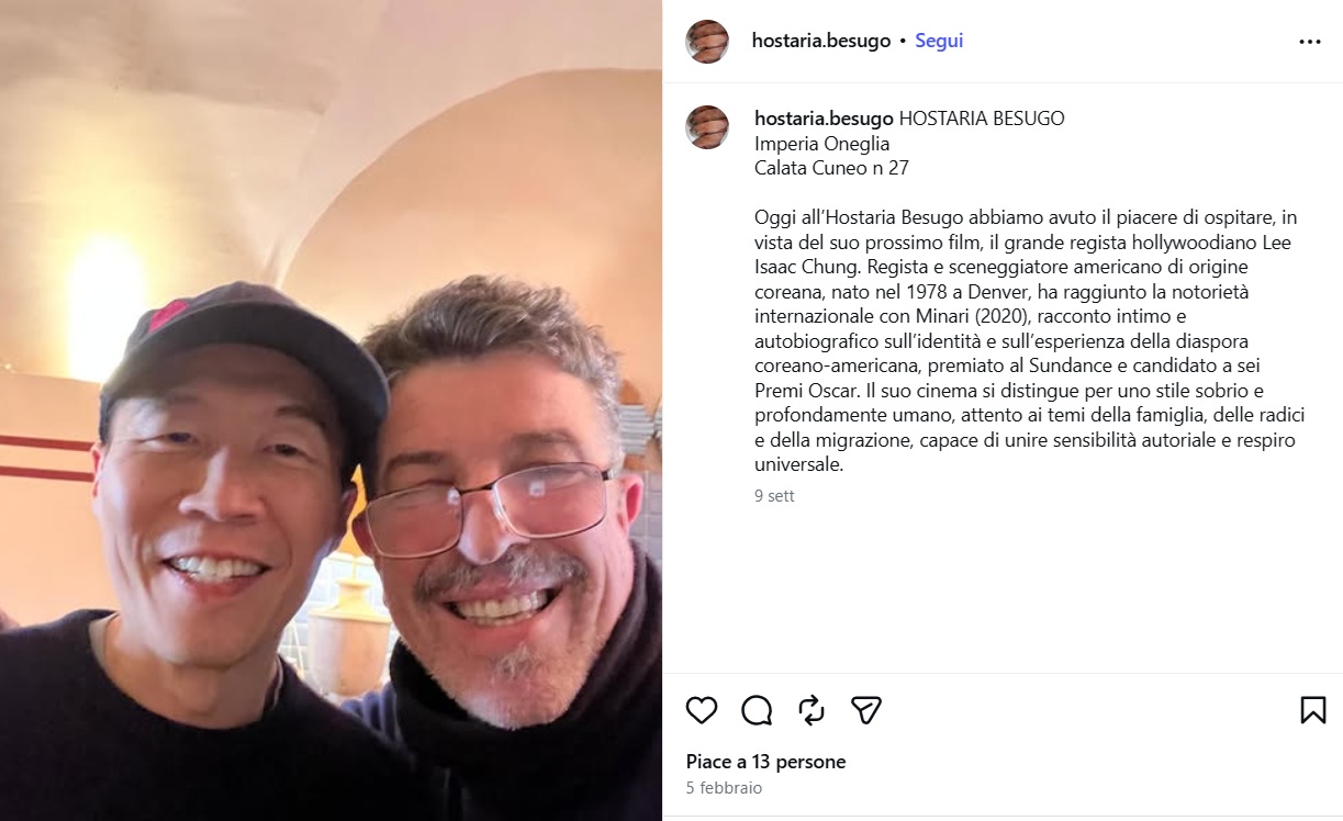 Come sia finito a Imperia e segnatamente all’Hostaria di Conte Bradley Cooper non si sa anche se potrebbe averglielo suggerito un altro personaggio del cinema americano, il regista di origini coreane Lee Isaac Chang, con il quale lo stesso Conte aveva postato una foto nel febbraio scorso.