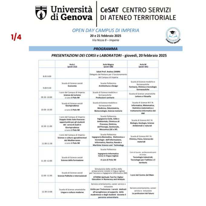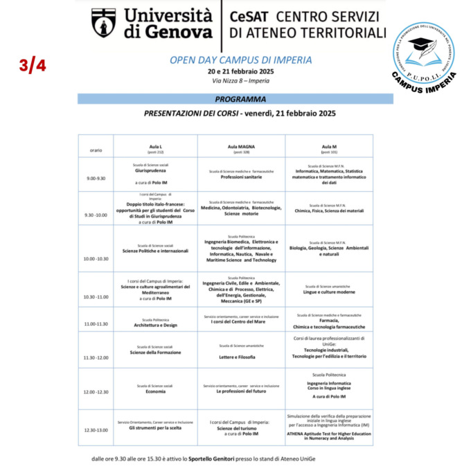 Giovedì 20 e venerdì 21 febbraio ci sarà la presentazione dell’intera offerta formativa dell’Università degli Studi di Genova