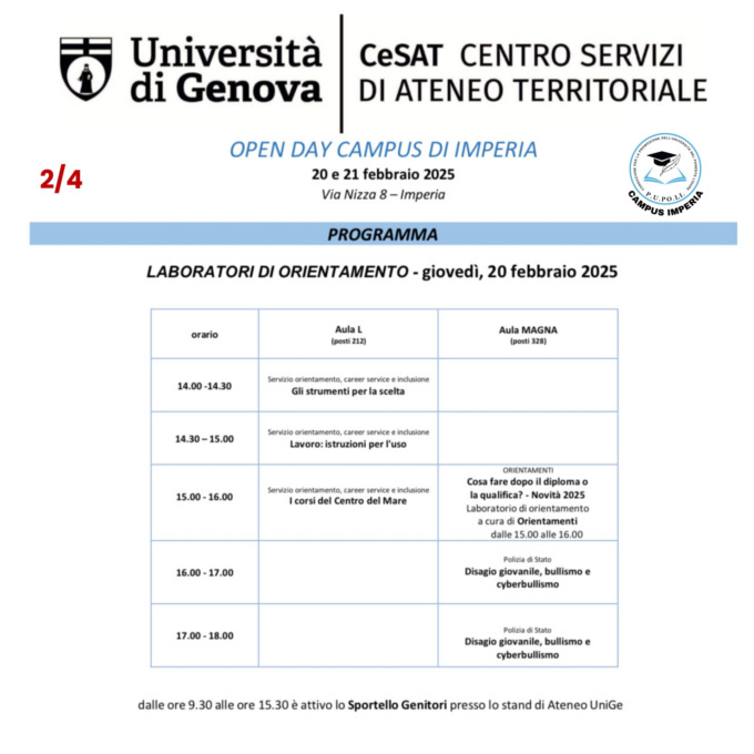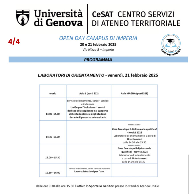 Ci siamo! Anche quest’anno il Campus Universitario di Imperia sta preparando due giornate dedicate all’orientamento universitario che si terranno giovedì 20 e venerdì 21 febbraio. L’occasione sarà unica per conoscere l’intera offerta formativa dell’Università di Genova, in particolare i cinque corsi di laurea che si possono trovare ad Imperia.