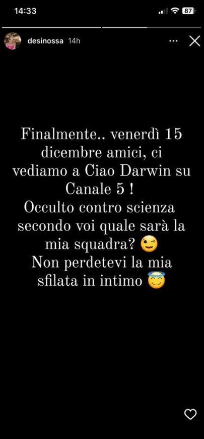 E’ la stessa ballerina e esperta di astro esoterismo, come si definisce sul suo profilo Instagram, a comunicare con una storia la sua partecipazione. “Finalmente, venerdì 15 dicembre amici, ci vediamo a Caio Darwin su Canale 5! Occulto contro scienza, secondo voi quale sarà la mia squadra? Non perdetevi la mia sfilata in intimo”. La donna è anche proprietaria dell’Hotel Fortuna di San Bartolomeo al Mare e aveva partecipato a “Primo appuntamento in Crociera” su Real Time.