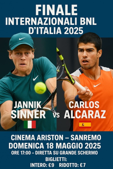 Domenica 18 maggio, il grande tennis sbarca sul grande schermo: il Cinema Ariston di Sanremo trasmetterà in diretta la finale degli Internazionali BNL d’Italia 2025, che vedrà protagonisti Jannik Sinner e Carlos Alcaraz. Il tennista n° 1 al mondo ha battuto ieri Tommy Paul, regalandosi la prima finale in carriera agli Internazionali di Roma. Una partita per nulla semplice per Sinner che è stato travolto dallo statunitense nel primo set finito 1-6. Poi la ripresa con un netto 6-0 nel secondo set e la vittoria arrivata al terzo set terminato 6-3 per il campione altoatesino.