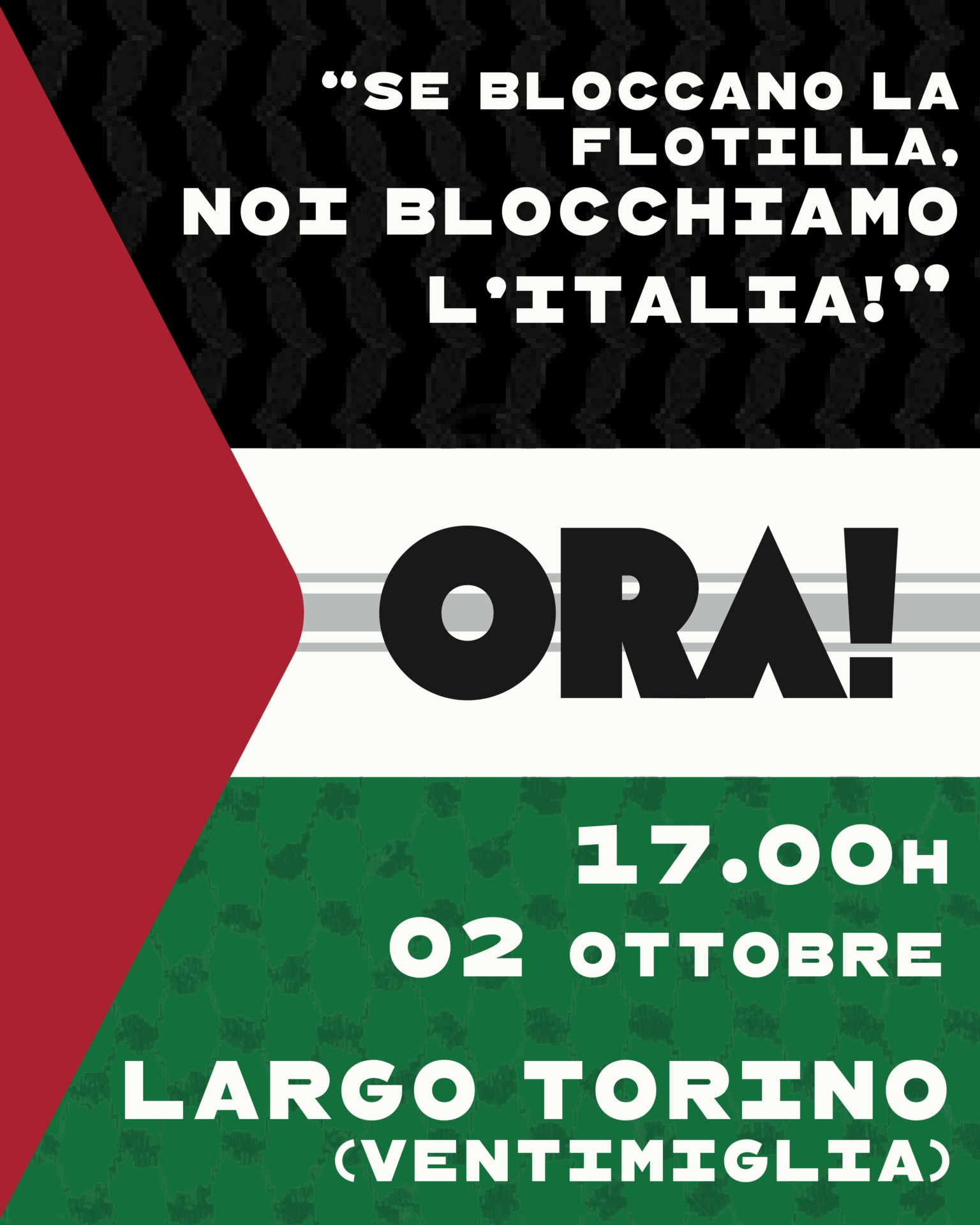 “Scendete in strada ora, perché è giunto il momento di smettere di essere complici. Oggi 02/10/2025, alle ore 17:00 saremo presso Largo Torino a Ventimiglia, perché Israele tolga le mani dalla Flotilla e da un popolo schiacciato da 75 anni di occupazione”.