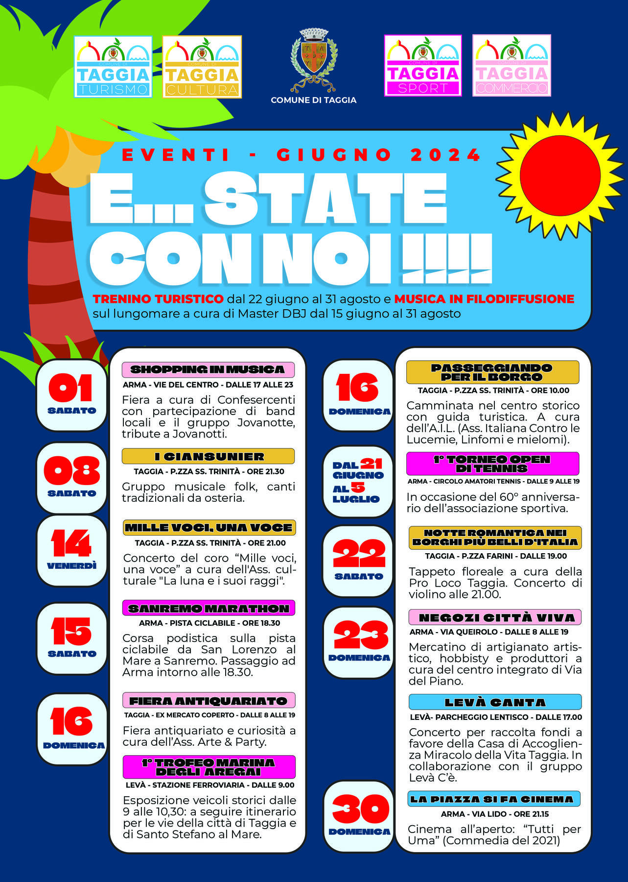 II Comune di Taggia si prepara all’estate con un calendario di eventi che interesserà tutto il mese di giugno.