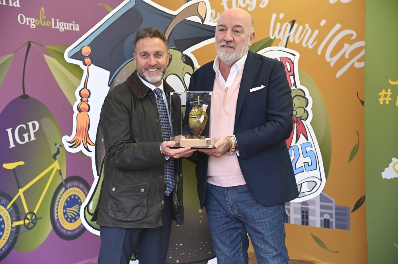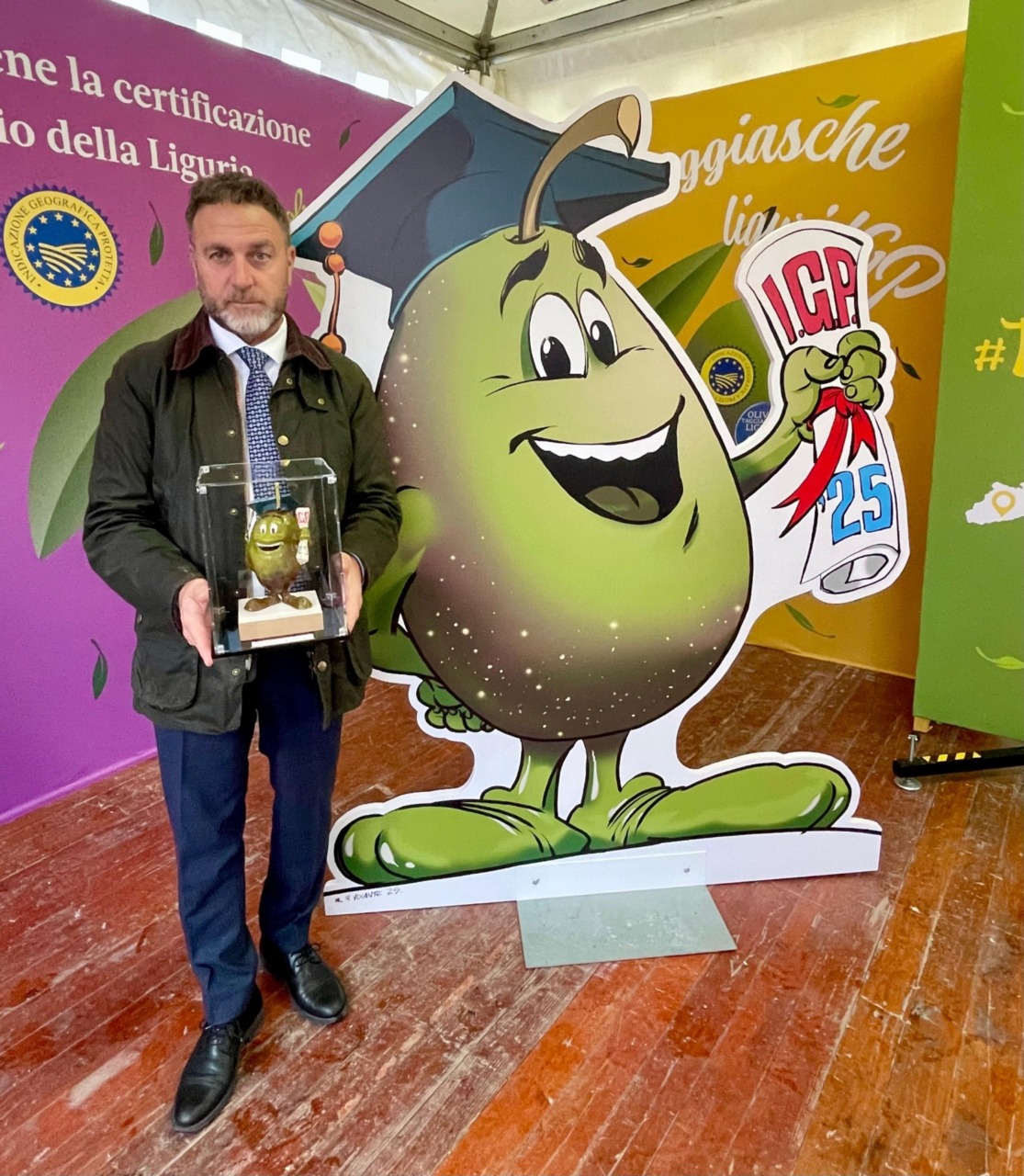 In occasione della venticinquesima edizione di Olioliva, presso lo stand di Regione Liguria, il vicepresidente con delega all’Agricoltura Alessandro Piana ha ricevuto da Confindustria Imperia una statua artigianale della mascotte dedicata all’ottenimento dell’Indicazione Geografica Protetta (IGP) dell’Oliva Taggiasca ligure, realizzata dallo scenografo e artista Giulio Magnetto.