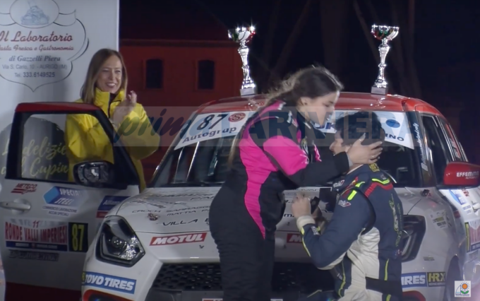 La proposta di matrimonio arriva alla premiazione dell’11/mo Rally Ronde della Valli Imperiesi. Protagonista il pilota Samuele Valzano (equipaggio 87, Suzuki Swift Sport Hybrid 1.4), che ieri sera, al momento di ricevere la coppa, come primi di classe per la categoria Ra5h (e venticinquesimi di gruppo), si è rivolto alla propria navigatrice, Adriana Georgiana Voicu, chiedendole la mano.