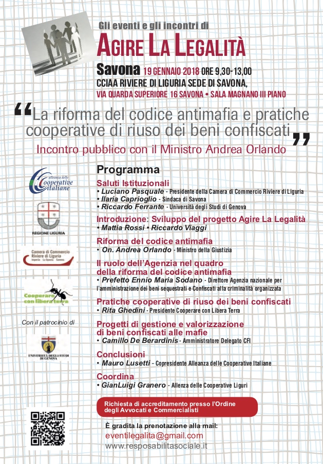 L’evento, primo del ciclo di incontri “Agire La Legalità”, è organizzato da Alleanza delle Cooperative Italiane Liguria in collaborazione con Camera di commercio Riviere di Liguria, Regione Liguria, Comune di Savona e Cooperare con Libera Terra – Agenzia per lo sviluppo cooperativo e la legalità. Si avvale del patrocinio dell’Università degli Studi di Genova.