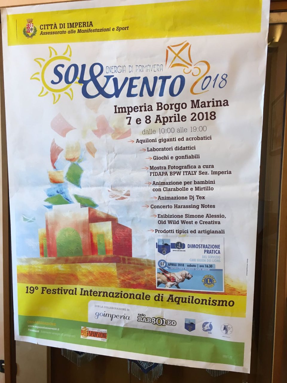 Ospite d’onore Giovanni Govoni di Bologna che pilota da solo tre aquiloni acrobatici. Ci sarà anche Arnaldo Mazzetto con le sue creazioni. Iniziativa collaterale la dimostrazione pratica del servizio cani guida dei Lions organizzato dal club La Torre di Imperia.