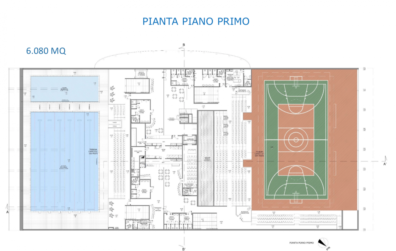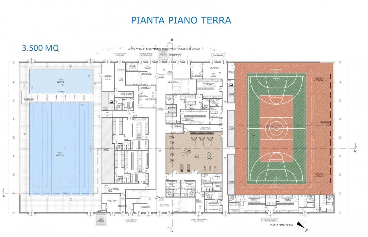 Il progetto prevede un piano interrato con locali tecnici, mentre nel grande piano terra sorgerà un’area gioco con due campi di pallavolo, pallamano, calcetto e basket. Verso il mare verranno invece realizzate due piscine, di cui una grande per adulti di 25 metri a sei corsie e una per i bambini. Non mancherà una palestra per il fitness.