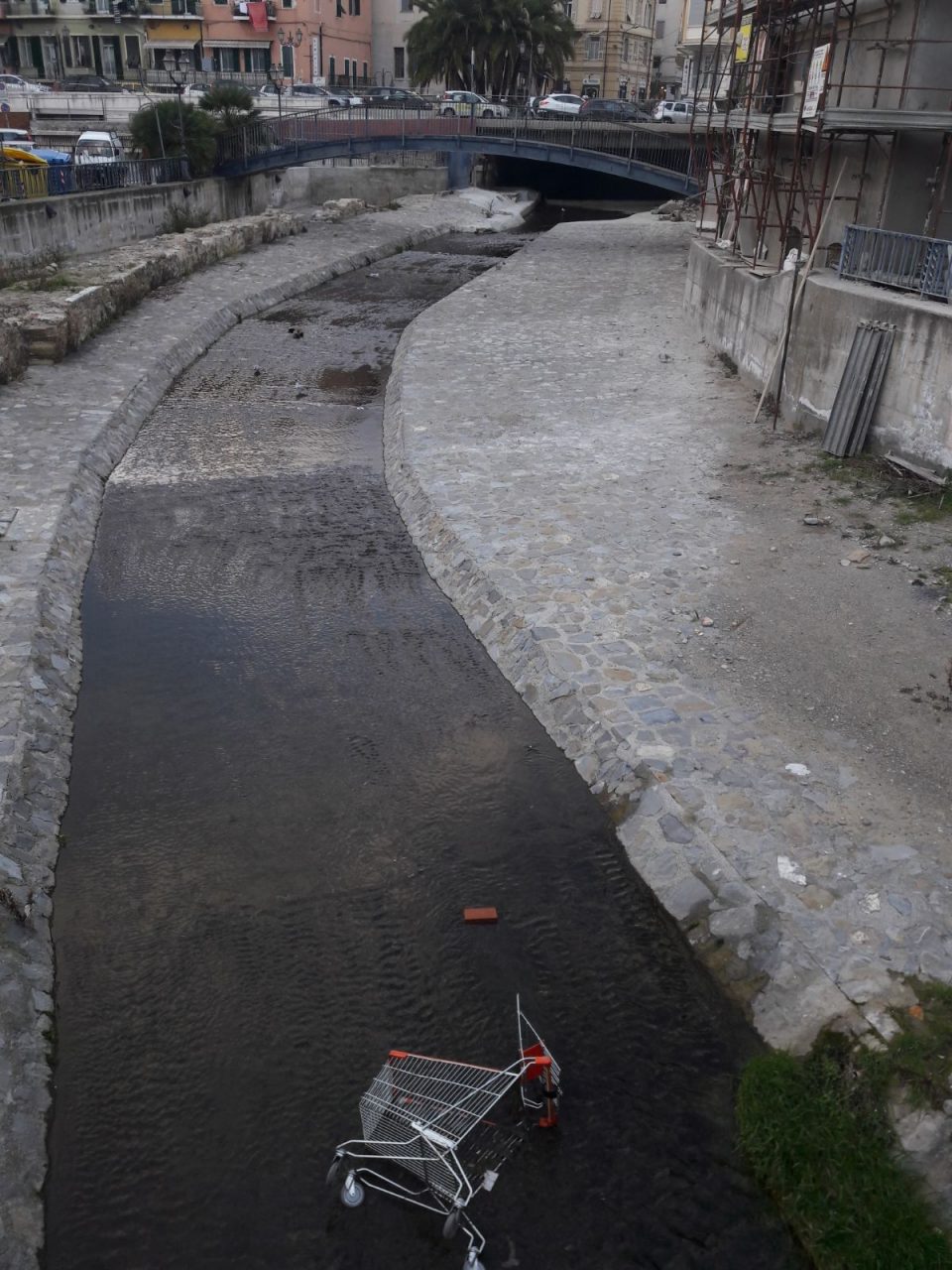 Cosa ci faccia un carrello della spesa alla foce del torrente San Francesco si può solo immaginare. Certamente, vista la scarsa presenza di acqua in questi giorni, il carrello non è stato portato dalla corrente, dunque una possibilità potrebbe essere quella di un abbandono alla fine della spesa. Non è chiaro se si tratti o meno di un carrello del vicino supermercato sul Porto Vecchio e del perché qualcuno abbia avuto la triste idea di gettarlo lì.