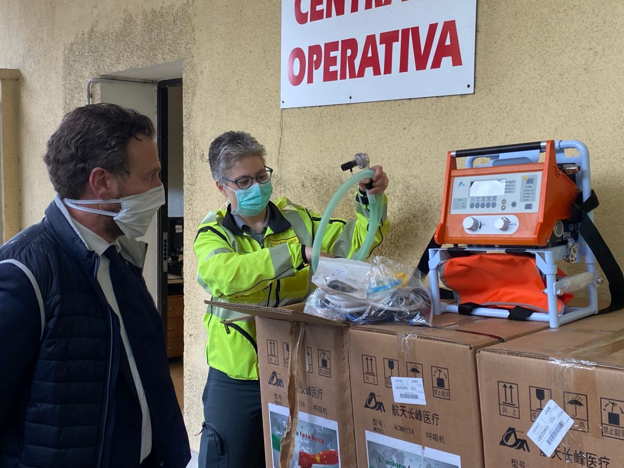 consegna da parte dell’Associazione Nazionale Alpini agli operatori del 118 di una serie di dispositivi, fra cui 25 respiratori polmonari e migliaia di kit
