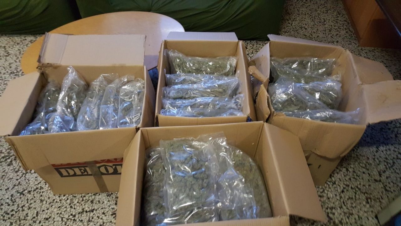 Un rapido giro esterno e subito i due cani antidroga Cally e Taca hanno mostrato un forte interesse per il semirimorchio e soprattutto per i pallets accatastativi dentro, attorno ai quali i cani hanno cominciato a grattare. A quel punto è stato facile scoprirvi occultati quattro scatoloni che, una volta aperti, hanno mostrato il loro contenuto: 40 involucri di cellophane sottovuoto contenenti oltre 42 kg di marijuana.