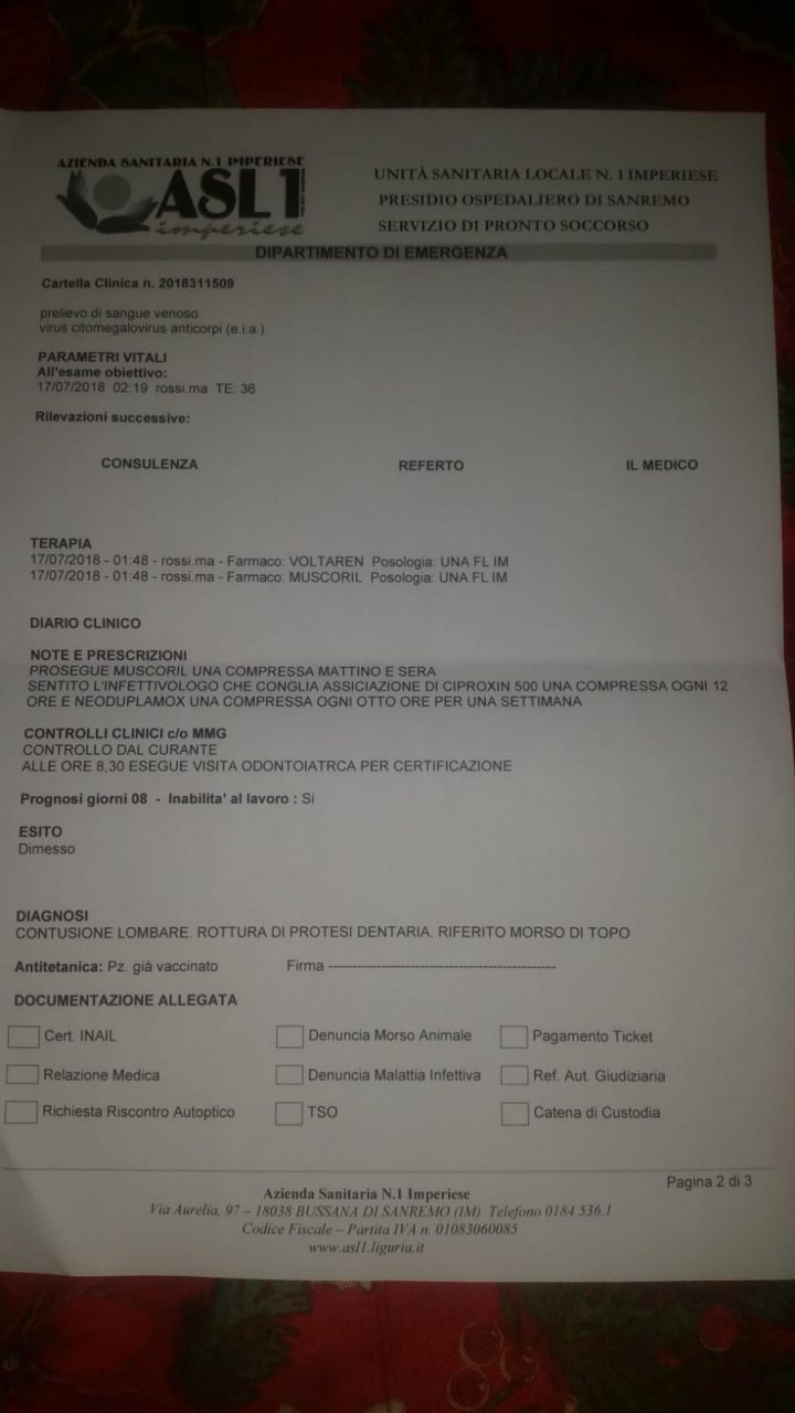 Caro direttore, Chi le scrive è un cittadino che non può più vedere la nostra città così nel degrado. Io amo Sanremo, la città mi ha adottato 38 anni fa’: orgoglioso di essere un sanremese, ma in questi ultimi anni, tra inciviltà delle persone, la latitanza delle persone preposte ,sentire i residenti della città dei fiori che è un mugugno unico . Volevo portare alla sua conoscenza due casi presi tra i tanti che sento : una signora che mentre buttava la spazzatura è scivolata in via Martiri ed è stata morsa da un topo (come foto allegata il referto medico del pronto soccorso)oppure il degrado di Vicolo Frantoi,una scalinata terra di nessuno posta tra via Agosti e via Martiri. Siringhe usate, erba alta che rende la scalinata scivolosa (ricordo che siamo in centro) .Non posso credere che esistono cittadini di serie A o serie B: spero che queste due righe possono arrivare a chi preposto per risolvere questi problemi