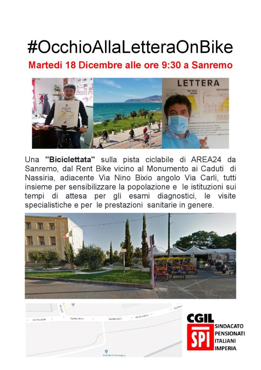 Domani mattina, martedì 18 dicembre, alle 9:30 a Sanremo, il Sindacato Pensionati Italiani SPI-CGIL promuove una “Biciclettata” sulla pista ciclabile di AREA24. L’appuntamento è dal Rent Bike vicino al Monumento ai Caduti di Nassiriya, adiacente Via Nino Bixio angolo Via Carli. Lo scopo è di sensibilizzare la popolazione e le istituzioni sui tempi di attesa per gli esami diagnostici, le visite specialistiche e per le prestazioni sanitarie in genere.