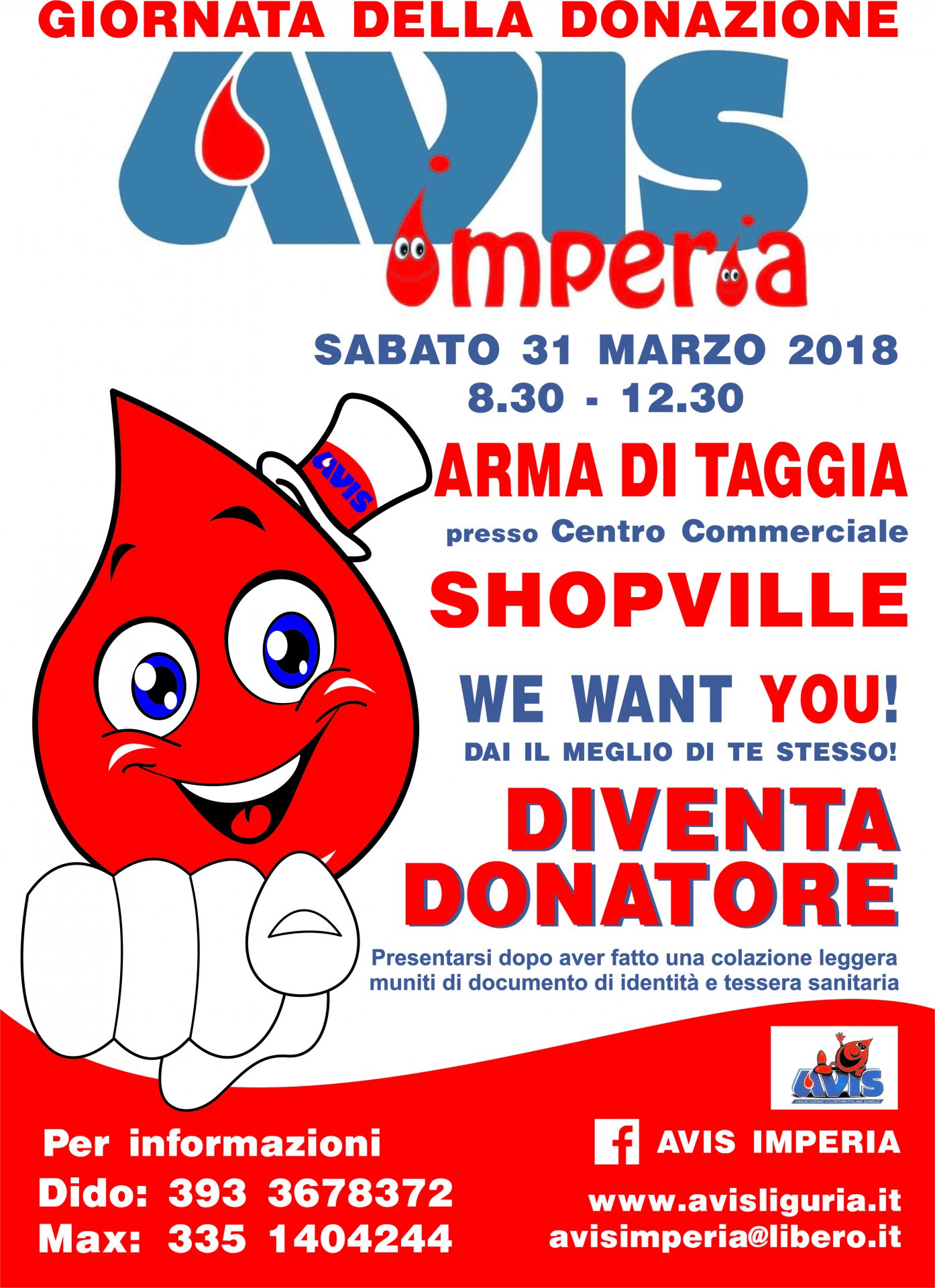 Sabato 31 marzo sarà possibile donare il sangue dalle 8:30 alle 12:30 presso il Centro Commerciale La Riviera Shopville ad Arma di Taggia.
