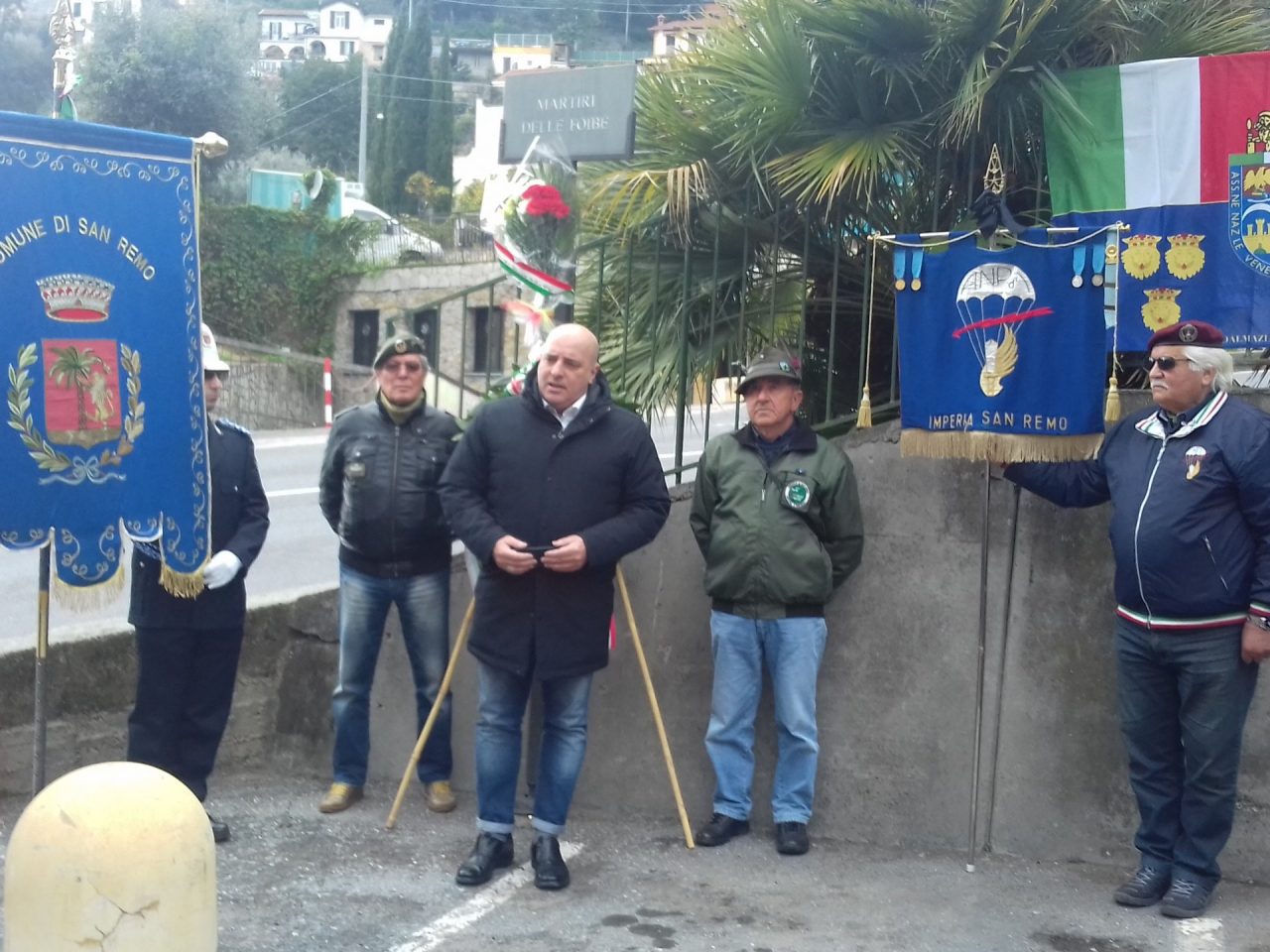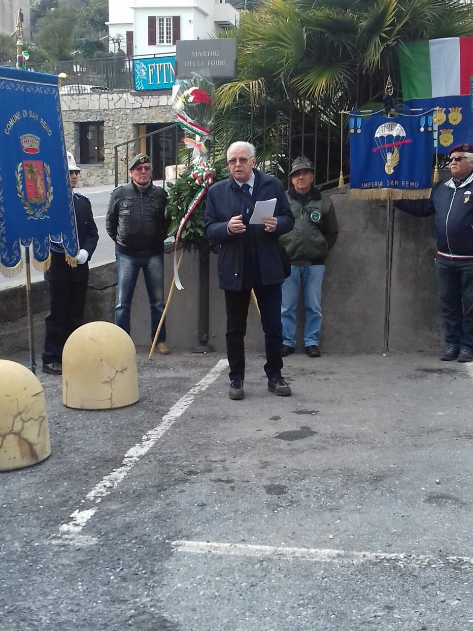 Domenica 10 febbraio ha avuto luogo in Via delle Foibe, nei pressi della targa ricordo, la commemorazione dei Martiri delle Foibe.  Presenti il l Vice sindaco Costanza Pireri, con il Gonfalone del Comune di Sanremo, dl’Assessore. Regionale Gianni Berrino; il l Comandante  Base Log. Tenente . Colonnello  Alessandro Recine, il Comandante  Capitano dei Carabinieri  Mario Bonucci;il Comandante Capitano  Guardia  di Finanza Luana Pelagalli;  il  Vice Commissario di Polizia di Stato e Vice Comandante. Vigili Urbani, Fulvio Ausonio; il   V.P. Assessore Dalmazia/Giuliana , Damiani Luciano; il l Dottor. Nicola Sparaco e  l’Associazione  Paracadutisti con 6 unità con a capo il Presidente  Russo, dei Gruppi  Alpini e l’ Ass. Autieri e Partigiani ha avuto luogo in Via delle Foibe, nei pressi della targa ricordo, la commemorazione dei Martiri delle Foibe.