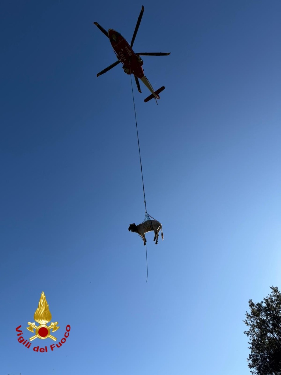 Elicottero dei vigili del fuoco recupera mucca finita in un vallone