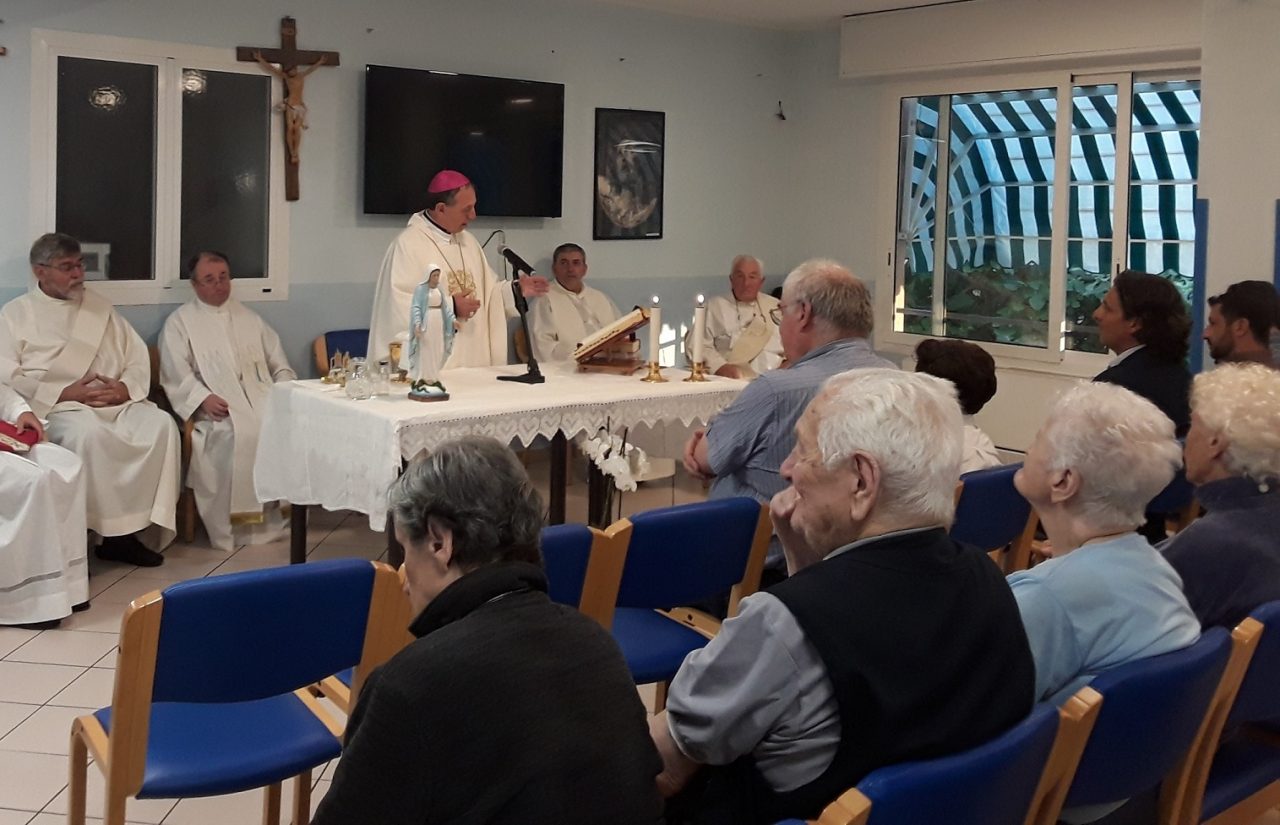 Tutta la grande famiglia di Casa Rachele ha partecipato alla Santa Messa celebrata, in fraterna unione con la comunità di San Rocco, dal Vescovo Antonio Suetta e concelebrata dal Parroco di San Rocco, Don Antonio Robu, da Don Giovanni Lubinu, Parroco di Maria Ausiliatrice di Vallecrosia, dal Diacono Achille Grassi, Vice Presidente della Fondazione, dal Diacono Adriano Garaccione, figlio di un Ospite della struttura e dal ministrante Giovanni.