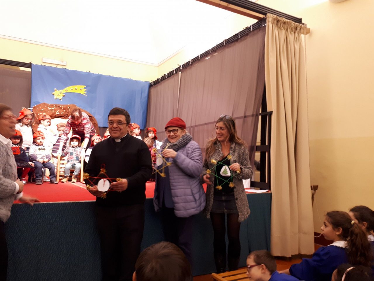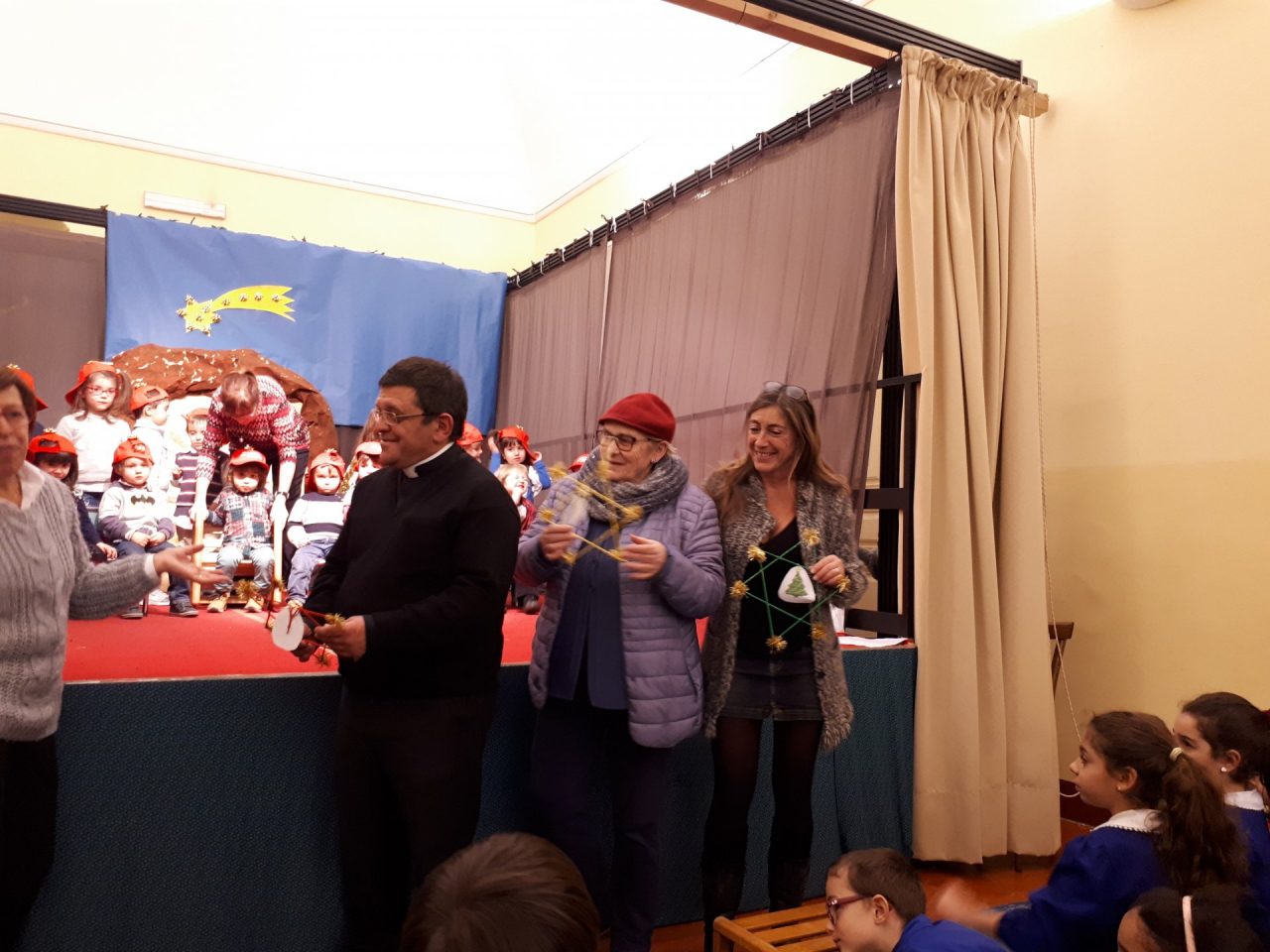 Al termine i bambini delle classi prime della primaria sono saliti sul palco per omaggiare le maestre e poi i più piccoli hanno fatto un dono al Sindaco Bruna Rebaudo, al parroco Don Luca, e a un membro della Fondazione di una stella fatta con le loro manine.