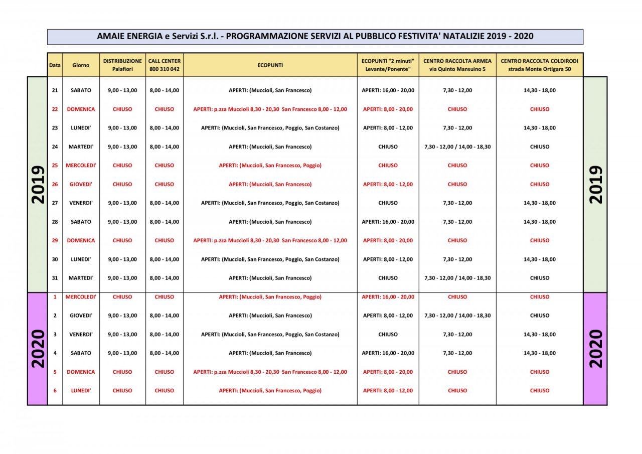 Amaie Energia precisa che, laddove non sono specificati, valgono gli orari consolidati da calendario e che sono previste aperture straordinarie degli “ecopunti 2 minuti”, a levante sotto lo svincolo di Valle Armea della Aurelia bis e a ponente in via Padre Semeria all’altezza di strada alla Colla: tali ecopunti saranno fruibili anche ai residenti e/o turisti che non saranno in grado di rispettare i calendari di raccolta del “porta a porta”.