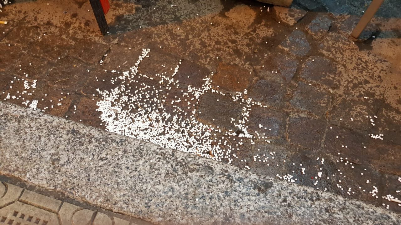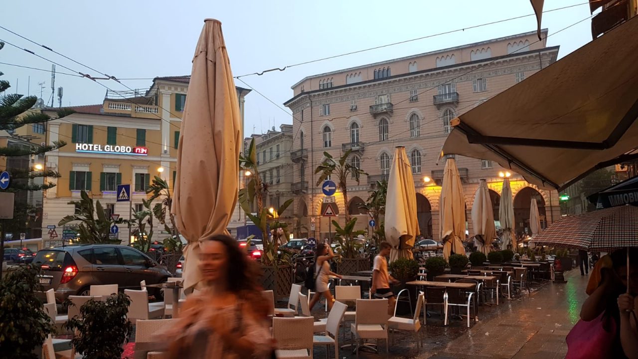 Si è svuotata con le prime gocce di pioggia piazza Colombo, colta da folate di vento improvvise e una grandinata intensa che ha fatto scappare tutti dai dehor e dalla strada.