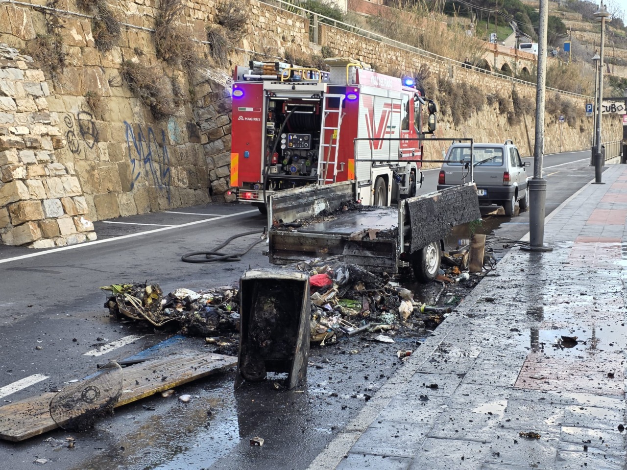 Intervento dei Vigili del Fuoco, questo pomeriggio, in zona Tre Ponti a Sanremo. In fiamme il carrello di un’auto.