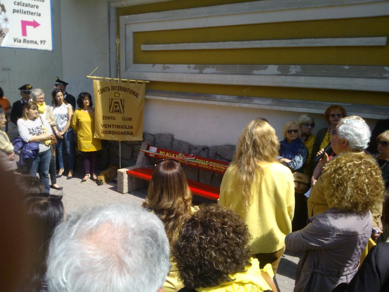 Il Sindaco di Vallecrosia Ferdinando Giordano e l’Assessore comunale alle Pari Opportunità Monica Barra,hanno inaugurato oggi , sabato 19 maggio, due panchine di colore rosso a simbolo delle “donne che non ci sono più”, uccise dalla violenza feroce di compagni, mariti, amici, parenti, conoscenti, a volte sconosciuti. La cerimonia è iniziata alle ore 11,00 presso la panchina posta dalla fermata dell’autobus nei pressi del Cinema Don Bosco in Via Colonello Aprosio, proseguita poi, sempre sulla stessa Via, per inaugurare quella posta nelle adiacenze del semaforo centrale. Questa in particolare è stata donata alla Comunità dalla stessa Assessore Monica Barra con i suoi gettoni di presenza.