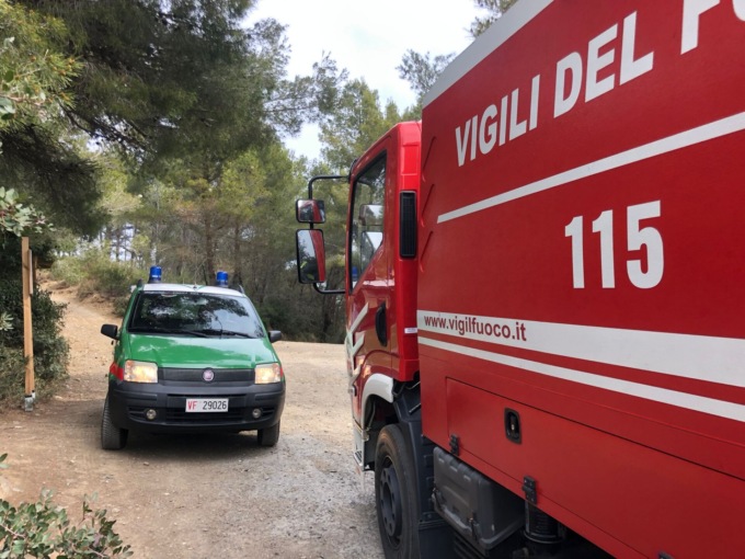 Vigili del fuoco in azione per un incendio boschivo scoppiato sulle alture di Cervo, presso il Parco del Ciapà, vicino al confine con la provincia di Savona.
