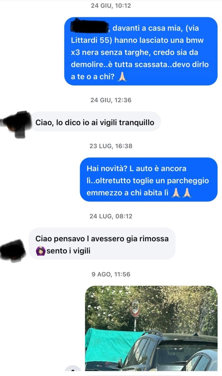 La donna ha pubblicato uno scambio di messaggi con un interlocutore – forse qualcuno vicino all’amministrazione comunale – che assicura di informare i Vigili urbani e anche una pec inviata allo stesso Comando della polizia municipale, datato luglio 2025. In oltre due mesi nessuno ha provveduto alla rimozione del veicolo, come detto privo di targa e parzialmente danneggiato.