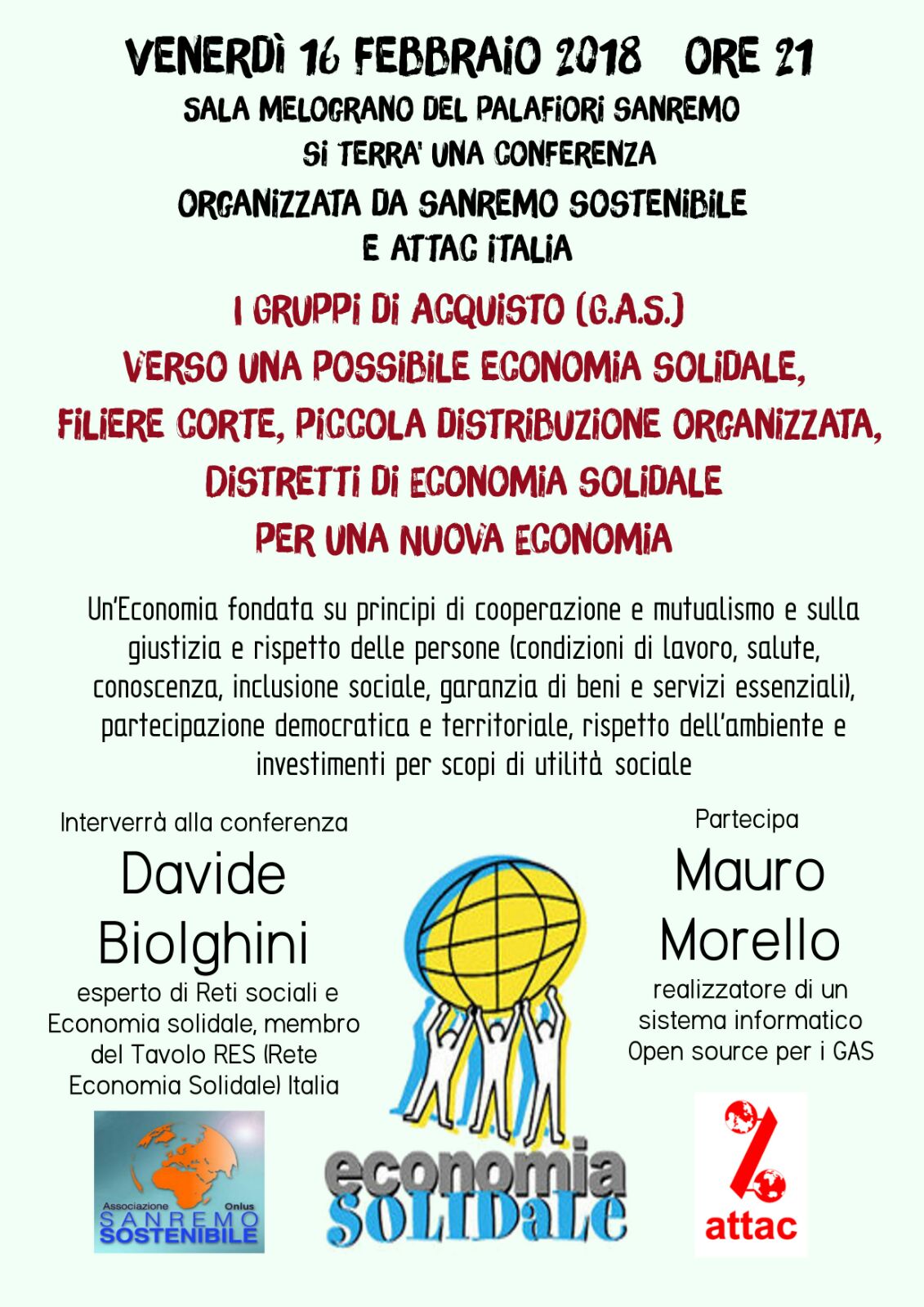 Venerdì 16 febbraio, alle ore 21, si terrà a Sanremo la conferenza sui Gruppi d’Acquisto Solidale (G.A.S.) organizzata da SANREMO SOSTENIBILE ONLUS e ATTAC presso la sala Melograno del Palafiori.