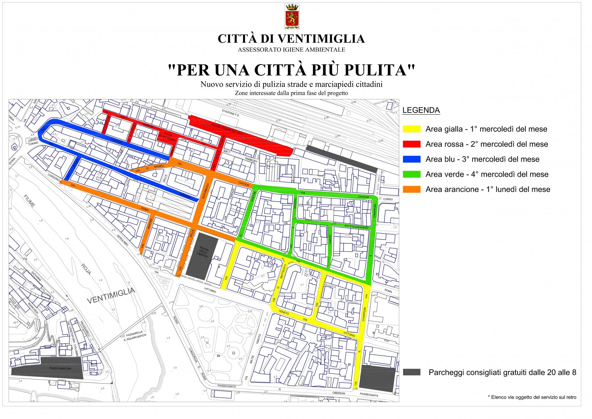 Dal mese scorso, nella città di Confine,  è attivo un nuovo servizio di spazzamento e lavaggio strade meccanizzato. Come già divulgato, interessa le vie centrali della città di Ventimiglia (in seguito si estenderà anche in altri quartieri) e avviene durante tutto l’anno, ad eccezione del mese di agosto; il centro è stato suddiviso in 5 zone, ciascuna delle quali è al centro dell’iniziativa una volta al mese (vedi cartina e calendario allegati). Il 7 maggio dalle (00 alle 06, la notte tra domenica e lunedì) la zona interessata sarà l’Arancione, mentre il 9 maggio sarà quella Rossa.
