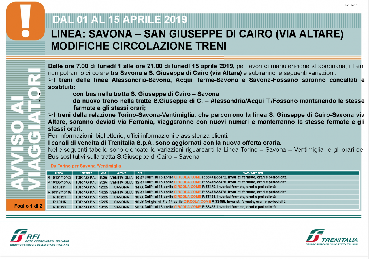 Dalle ore 7 di lunedì 1° aprile alle ore 21 di lunedì 15 aprile i treni delle linee Alessandria-Savona, Acqui Terme-Savona e Savona-Fossano, nella tratta Savona e S. Giuseppe di Cairo non percorreranno l’itinerario via Altare.