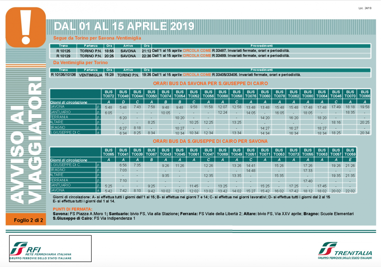 Per consentire ai tecnici di “Terna Rete Italia” di eseguire attività di manutenzione straordinaria al proprio elettrodotto “Vado Ligure – Vignole Borbera” i treni previsti in circolazione sulle linee Alessandria-Savona, Acqui Terme-Savona e Savona-Fossano saranno cancellati e sostituiti con bus nella tratta S. Giuseppe di Cairo – Savona e da nuovi treni nelle tratte S. Giuseppe di Cairo – Alessandria/Acqui Terme/Fossano mantenendo le stesse fermate e gli stessi orari.