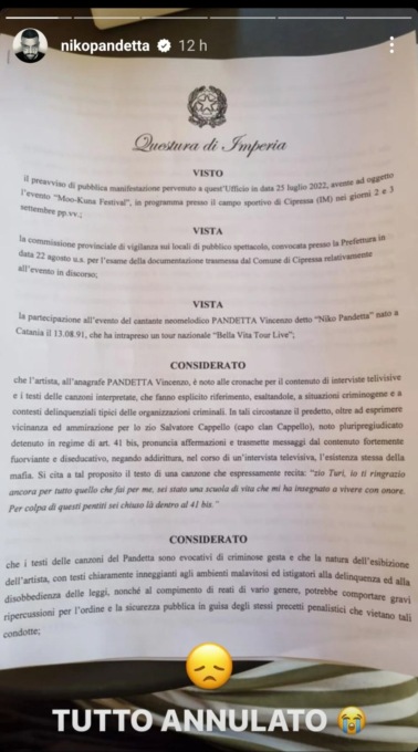 Il questore di Imperia Giuseppe Felice Peritore ha emesso una prescrizione di divieto (in base all’articolo 18 del Tupls) con la quale ha vietato l’esibizione del trapper neomelodico siciliano Vincenzo Pandetta (in arte Niko), per motivi di ordine e sicurezza pubblica. A scatenare il caso è stata l’associazione Libera, che ha puntato il dito contro l’artista per aver dedicato allo zio – il boss catanese Salvatore Cappello, al 41bis dal 1993 – una canzone dal titolo “Dedicata a te”. Il giovane artista avrebbe dovuto esibirsi al Moo-Kuna Festival, in programma al campo sportivo di Cipressa il 2-3 settembre prossimi.