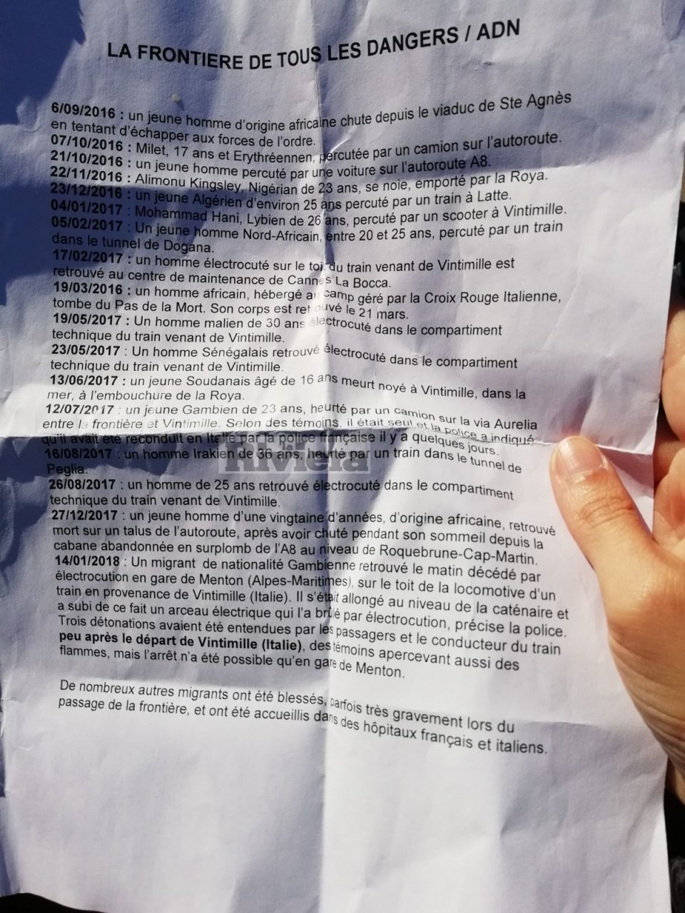 Presente anche il responsabile della Caritas Intemelia, Maurizio Marmo: “Credo che sia una manifestazione importante, organizzata da associazioni e movimenti francesi, che cercano di sensibilizzare sul tema della mobilità delle persone e sul diritto dei migranti a viaggiare. Questa iniziativa, che parte da Ventimiglia per arrivare a Calais, sottolinea la situazione di due frontiere, in cui si stanno vivendo problemi forti legati al blocco di queste persone”. Sui passaggi alla frontiera italo francese di Ventimiglia, Marmo afferma: “C’è stata una riduzione dei passaggi che era già avvenuta nei giorni precedenti (allo sgombero del greto del fiume Roja, ndr). Ora siamo sulle 40-50 persone che quotidianamente si recano da noi per ricevere assistenza. Altri invece si sono sparpagliati: chi è andato a Parco Roja e chi resta fuori”. Sul fatto che non tutti vanno al Parco Roja: “Da una parte ci sono persone che cambiano e dall’altra c’è chi, comunque, ha timore di dover lasciare le impronte, perché spera di avere più chance per chiedere asilo in un altro Paese europeo”.
