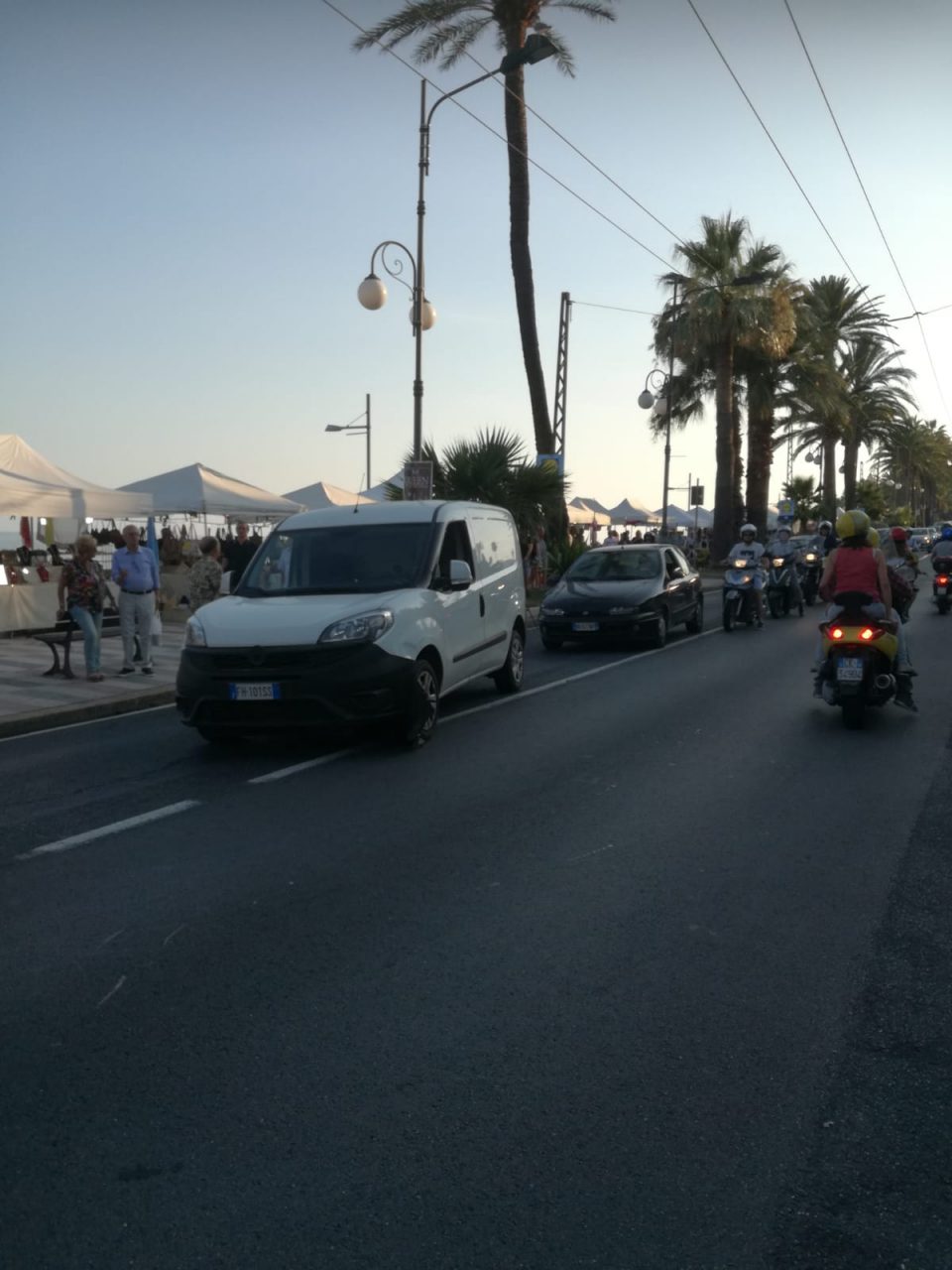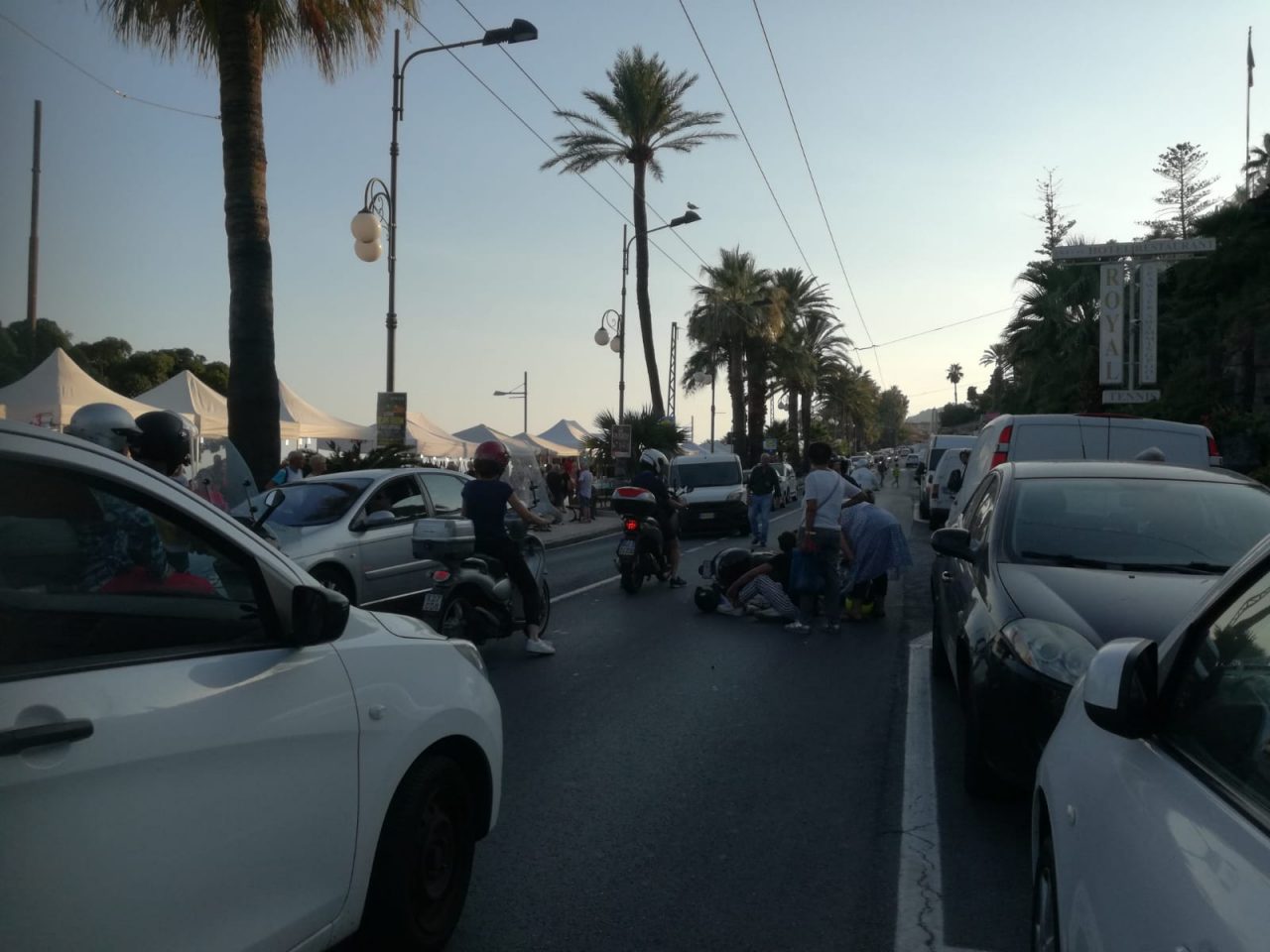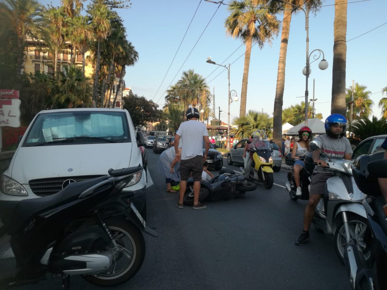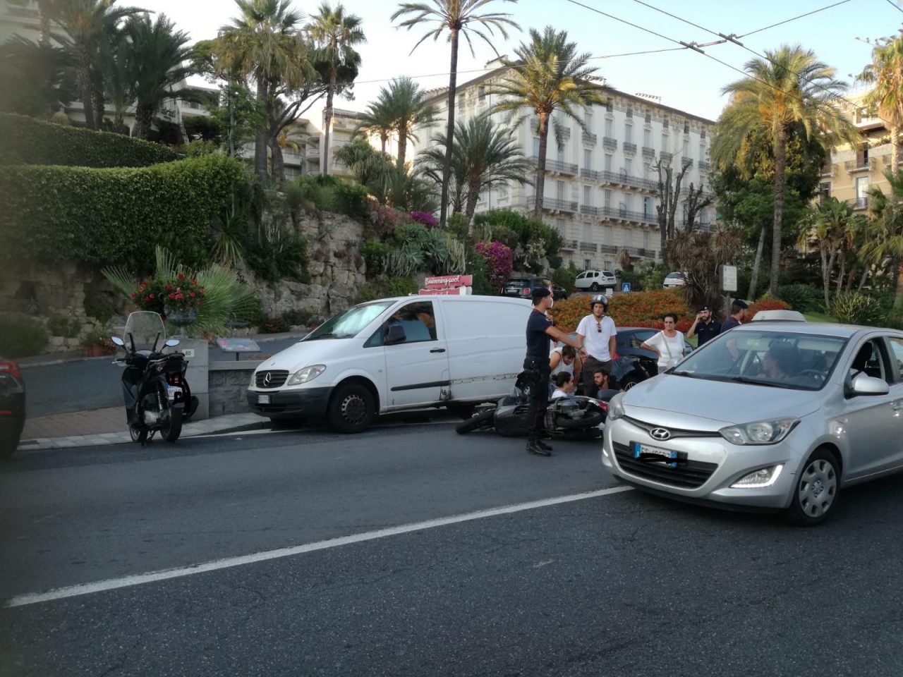 Traffico in tilt in corso Imperatrice a Sanremo, dove uno scooter con a bordo una coppia di ragazzi si è scontrato contro un furgone Fiat Doblò.