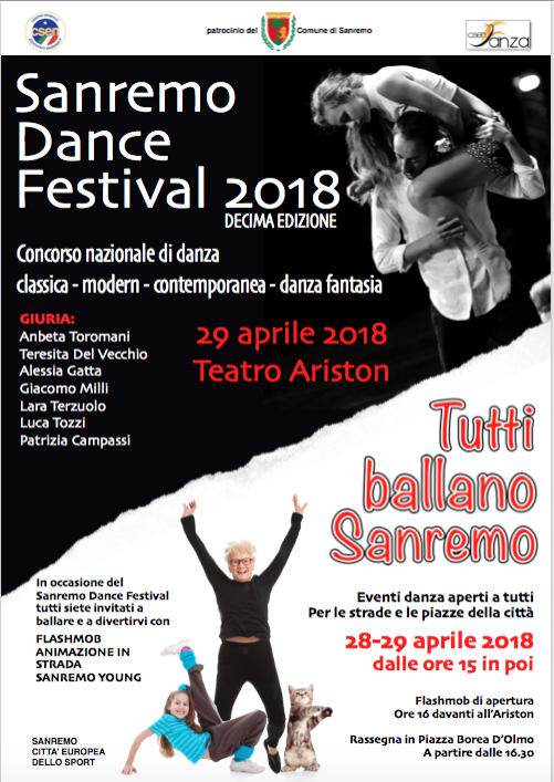 Il 29 aprile si aprirà il sipario del Teatro Ariston sulla decima edizione del Sanremo Dance Festival , concorso nazionale di danza classica, modern, contemporanea, danza fantasia che vedrà sul prestigioso palco sanremese più di 35 scuole di danza provenienti da tutta Italia, 700 ballerini, 160 coreografie per più di 14 ore di spettacolo sotto lo sguardo attento di una giuria composta, come ogni anno, da star della danza.