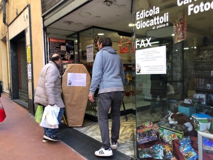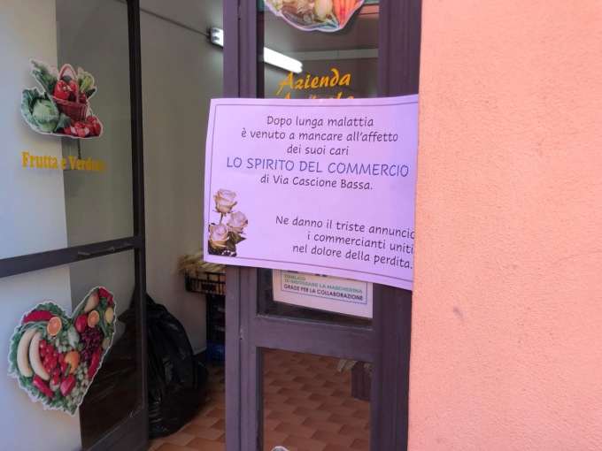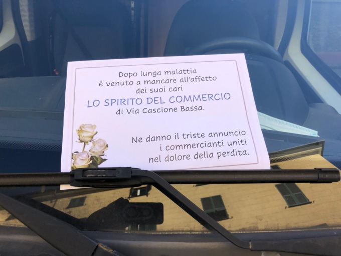“Dopo una lunga malattia è venuto a mancare all’affetto dei suoi cari lo spirito del commercio di via Cascione bassa”. Sono queste le parole dei commercianti di via Cascione, a Imperia, impegnati in una protesta a causa della situazione che avrebbe portato a un drastico calo del flusso di clienti nella centrale via di Porto Maurizio.