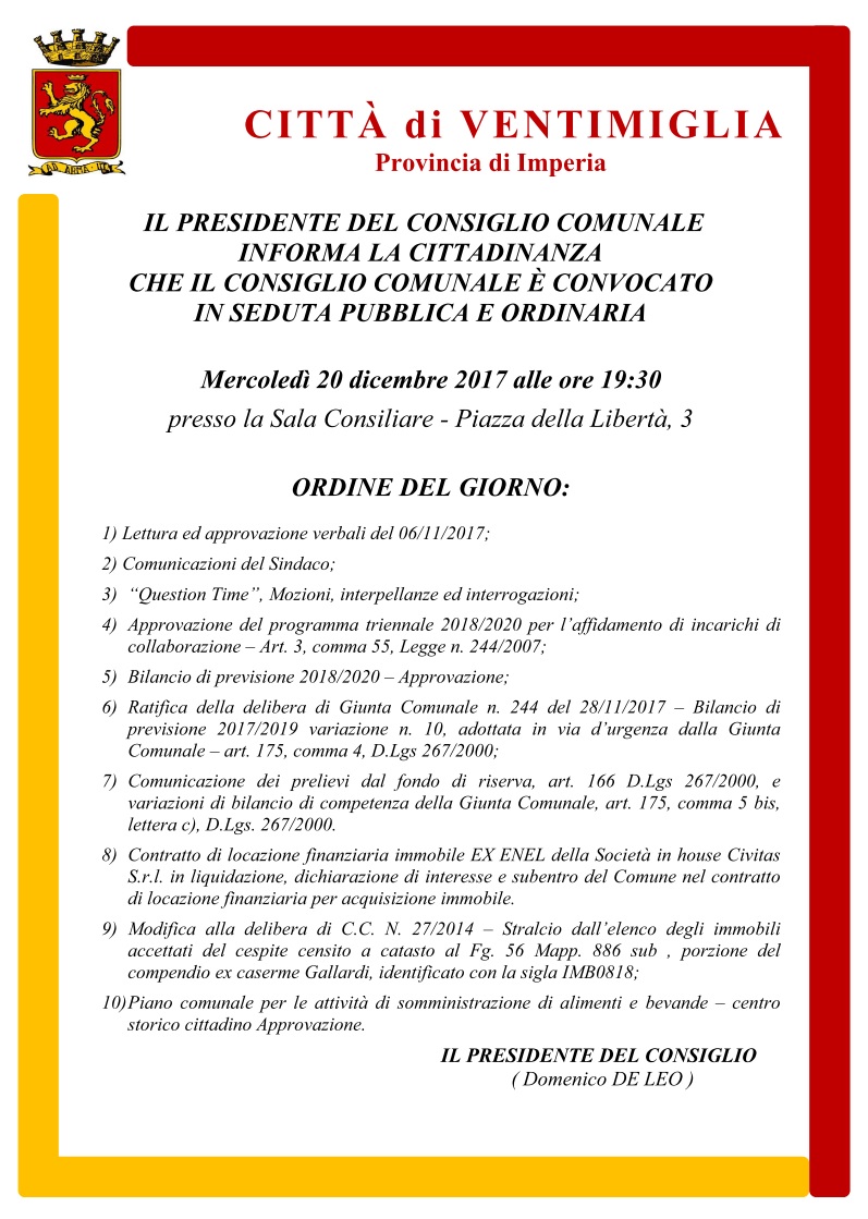 Questa sera a Ventimiglia, alle ore 19:30, è convocato il Consiglio comunale in una seduta pubblica e ordinaria.