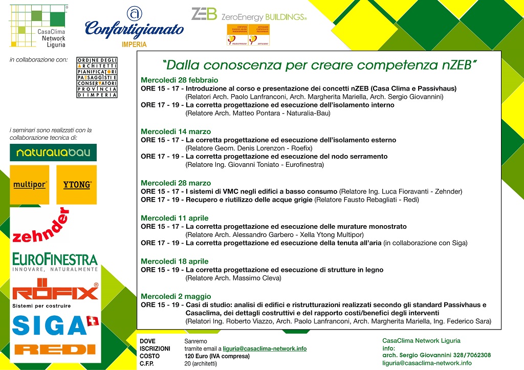 Consapevoli che al giorno d’oggi è sempre più importante acquisire nuove competenze e aggiornare la propria professionalità in campo energetico, ambientale ed edile, il network CasaClima Liguria in collaborazione con la Confartigianato e l’impresa ZeroEnergy Builldings propongono un pacchetto      formativo indirizzato agli addetti ai lavori con l’obiettivo di fornire a imprese e progettisti gli strumenti per adeguare la propria struttura alle trasformazioni in atto nel settore edile per effetto delle varie normative europee ed Italiane.